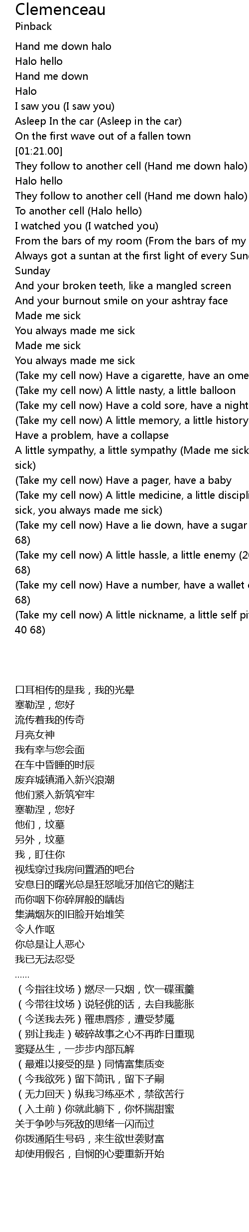 | [04:16.07] | (Take my cell now) Have a lie down, have a sugar hand (20 40 68, 20 40 68) |