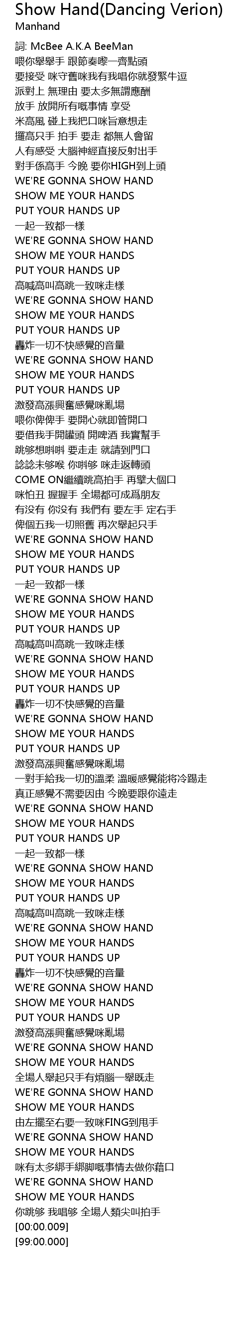 | [01:22.51] | SHOW ME YOUR HANDS |