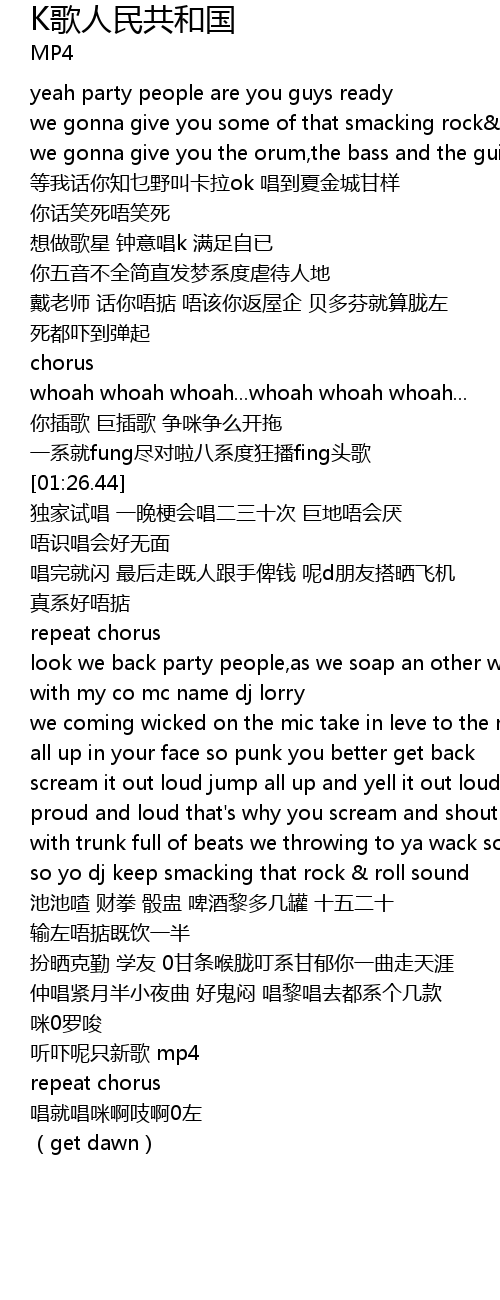 | [01:19.16] | 你插歌 巨插歌 争咪争么开拖 一系就fung尽对啦八系度狂播fing头歌 |