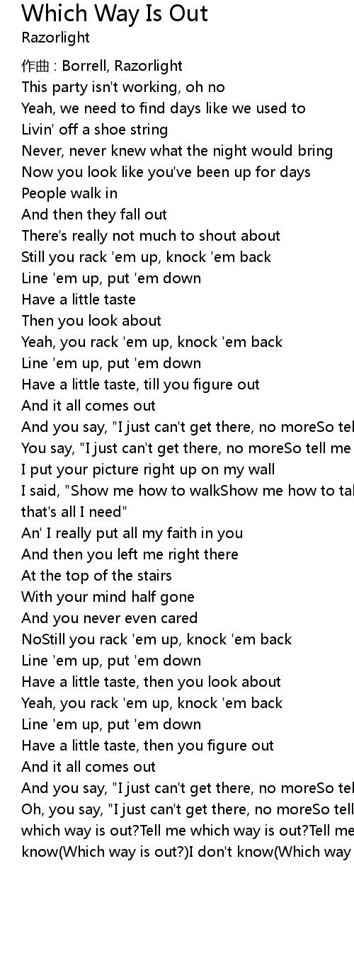 | Oh, you say, " I just can' t get there, no moreSo tell me which way is out? Tell me which way is out? Tell me which way is out? Tell me which wayI don' t knowI don' t know Which way is out? I don' t know Which way is out? I don' t know |