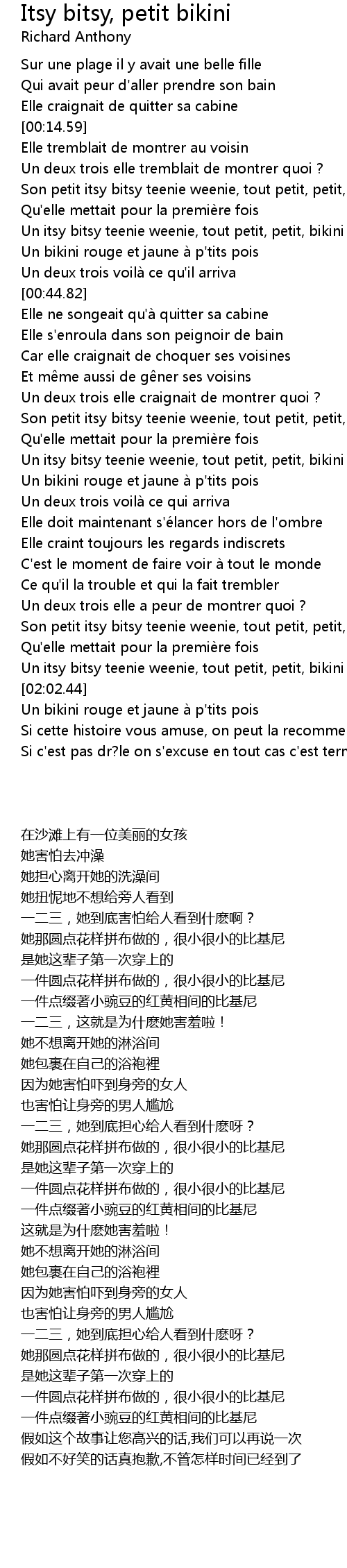 | [01:49.99] | Son petit itsy bitsy teenie weenie, tout petit, petit, bikini |