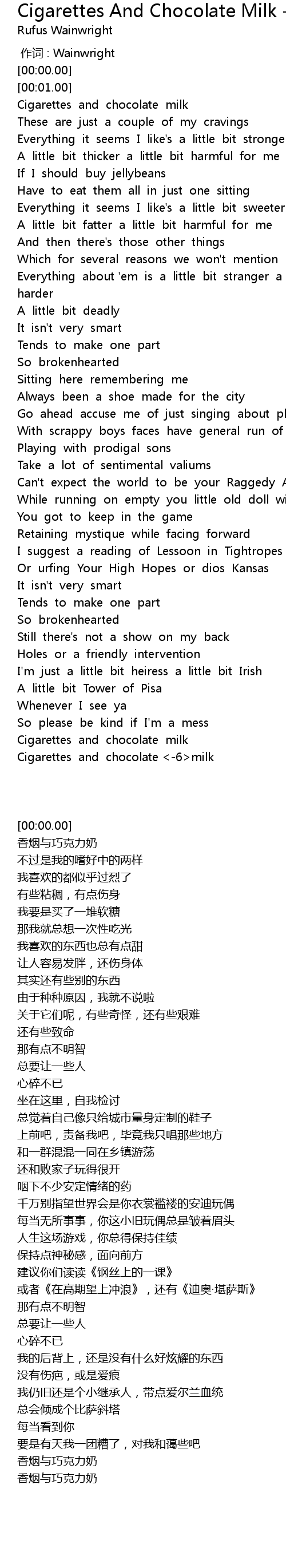 | [03:42.21] | Cigarettes and chocolate <-6>milk |