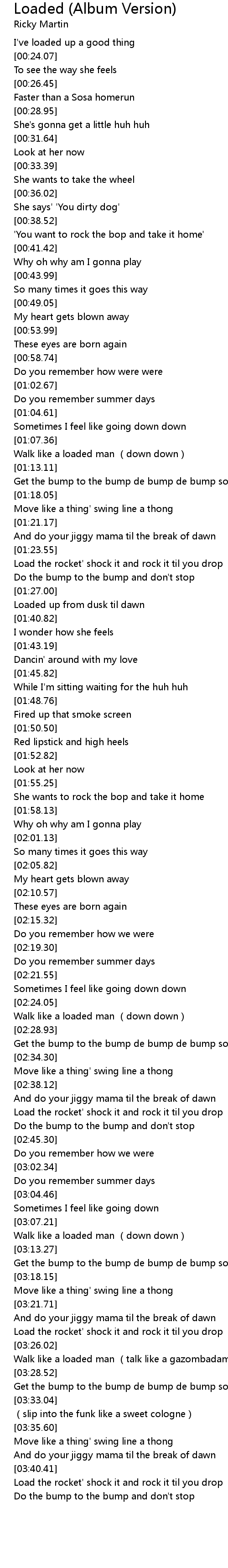 | [03:24.15] | Load the rocket' shock it and rock it til you drop |