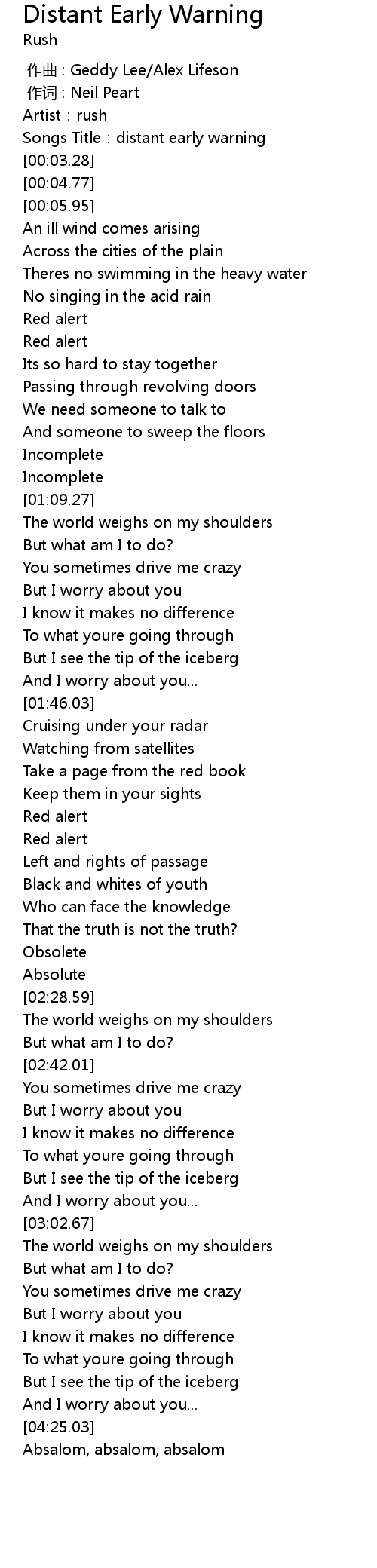 | [00:01.52] | Songs Title:distant early warning |