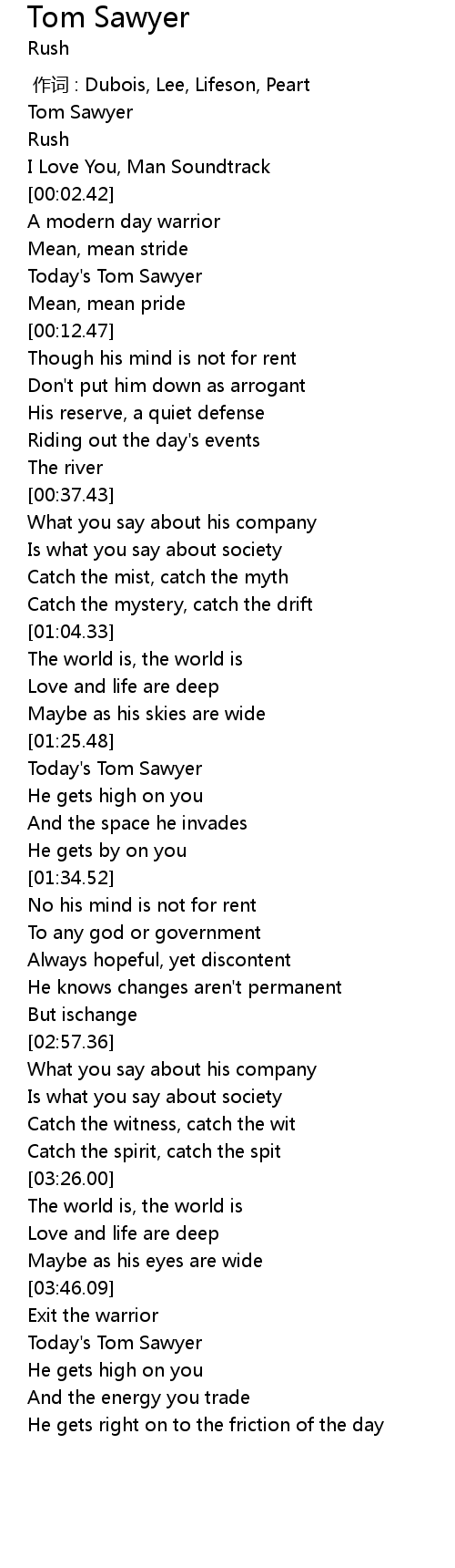 | [00:00.00] | 作词 : Dubois, Lee, Lifeson, Peart |