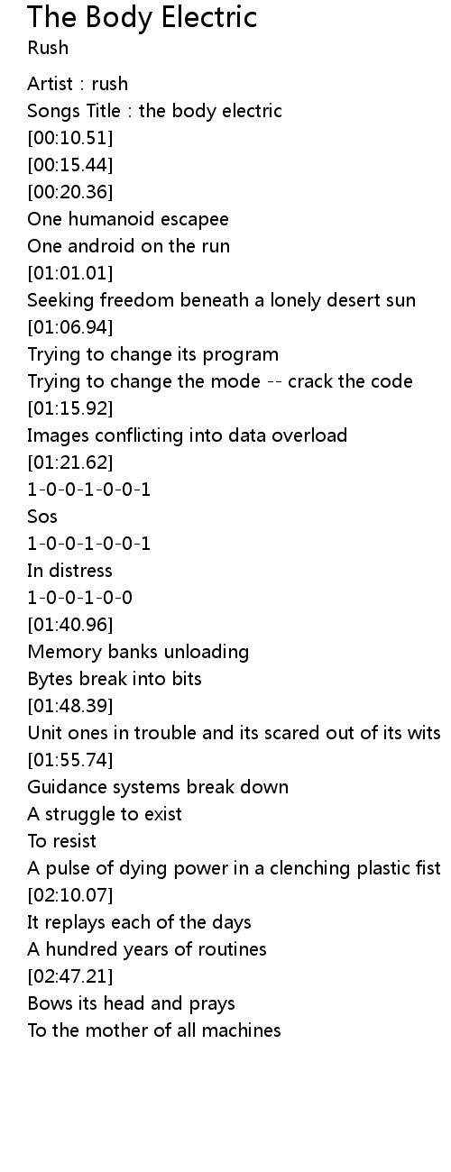 | [02:04.75] | A pulse of dying power in a clenching plastic fist |