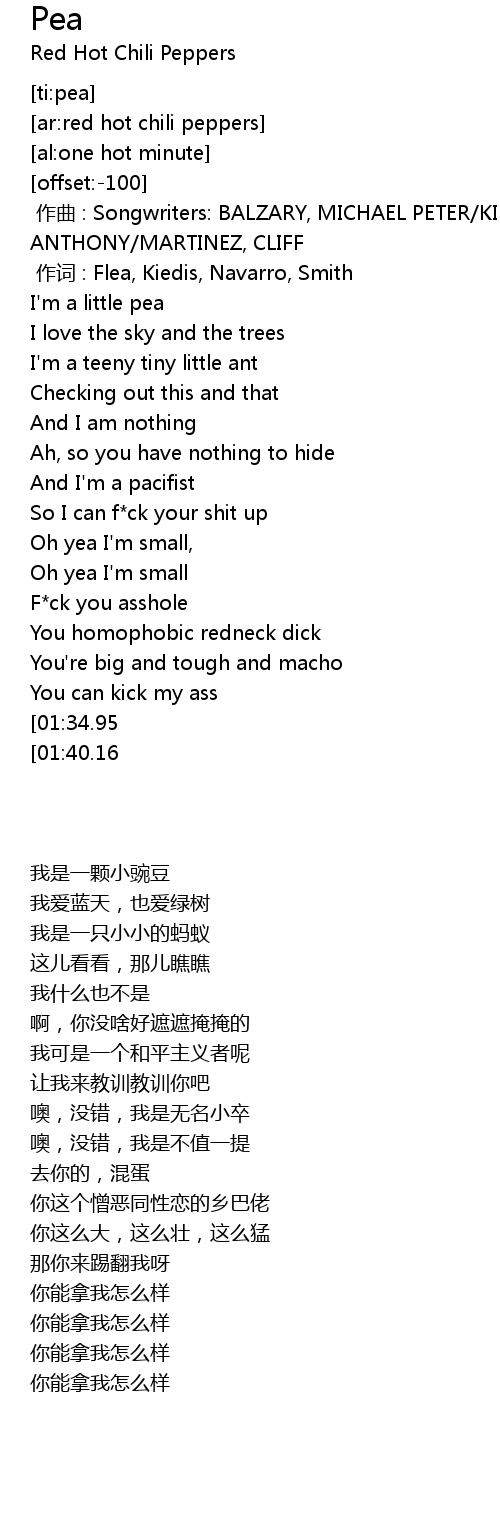| [00:00.366] | zuo ci : Flea, Kiedis, Navarro, Smith |