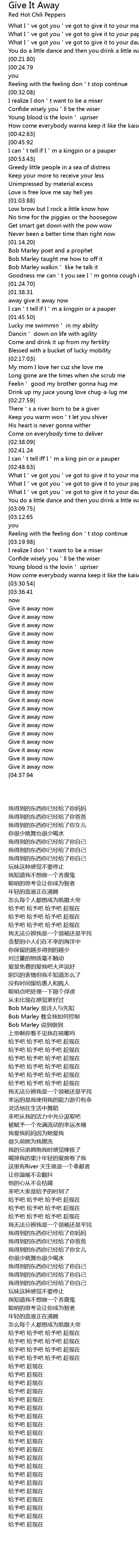 | [03:38.79][03:36.41][03:33.80][03:30.81] | Give it away give it away give it away now |