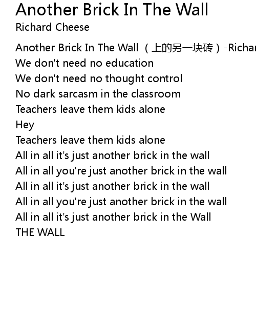 | [00:00.00] | Another Brick In The Wall shàng de lìng yí kuài zhuān Richard Cheese |