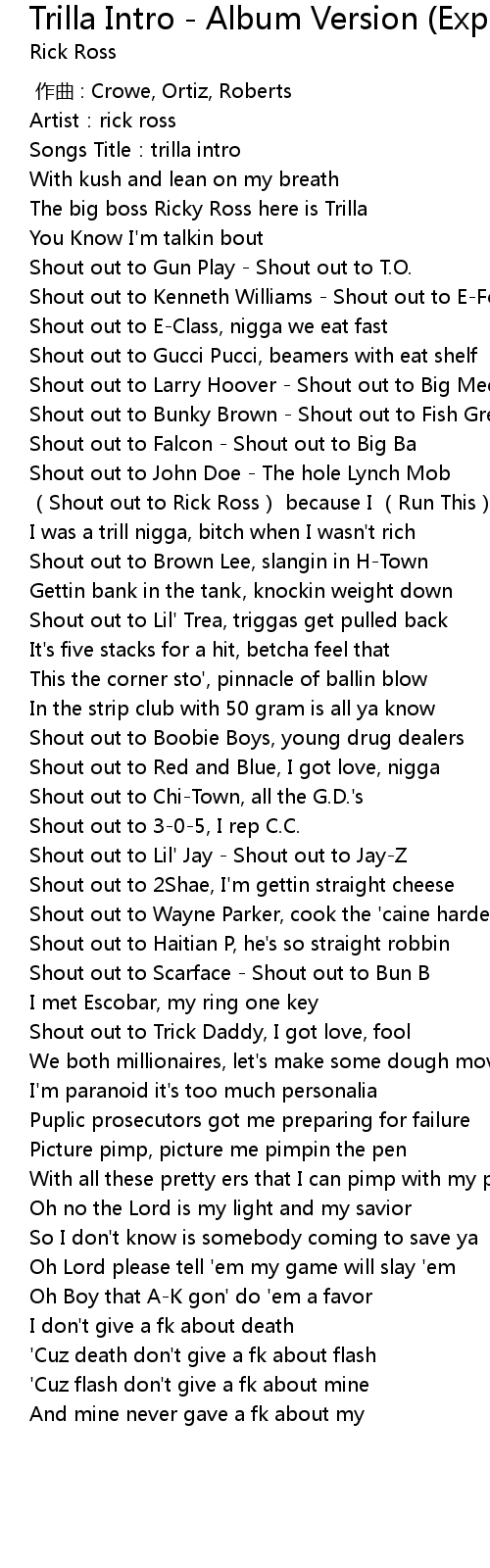 | [00:06.79] | The big boss Ricky Ross here is Trilla |