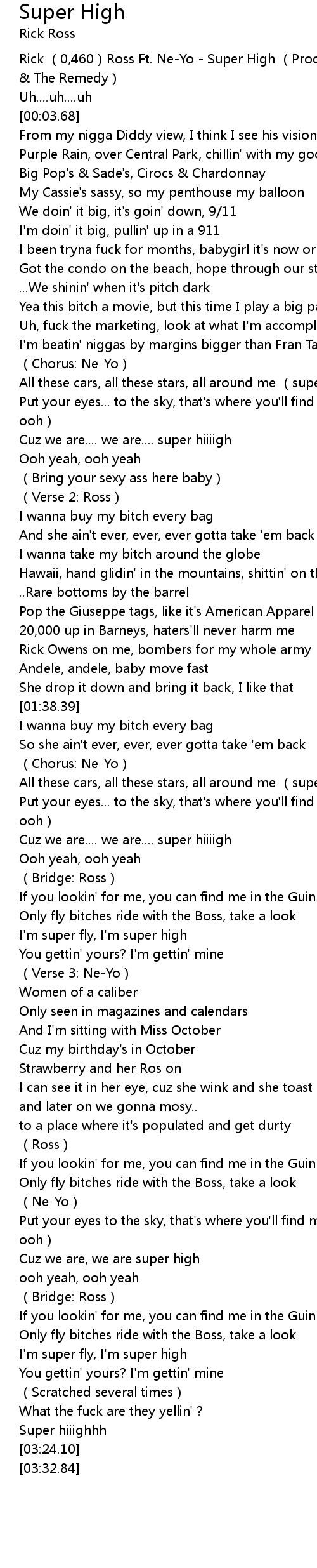 | [00:00.00] | Rick (0,460)Ross Ft. Ne-Yo - Super High (Prod. by DJ Clark Kent & The Remedy) |