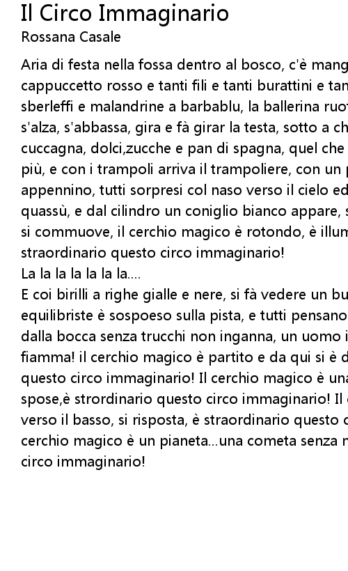 | E coi birilli a righe gialle e nere, si fà vedere un buffo giocoliere, l' equilibriste è sospoeso sulla pista, e tutti pensano chissà come farà! e dalla bocca senza trucchi non inganna, un uomo in canna, tira e sputa la sua fiamma! il cerchio magico è partito e da qui si è divertito, è straordinario questo circo immaginario! Il cerchio magico è una casa senza porte,senza spose,è strordinario questo circo immaginario! Il cerchio magico s' abbassa verso il basso, si risposta, è straordinario questo circo immaginario! Il cerchio magico è un pianeta...una cometa senza meta... è straordinario questo circo immaginario! |