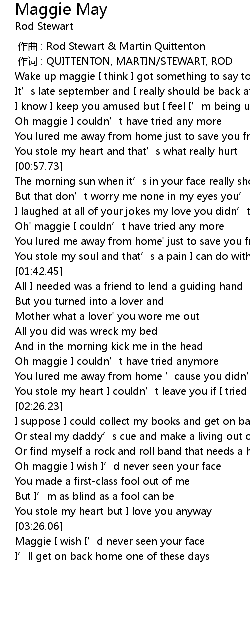 | [03:06.07] | Oh maggie I wish I' d never seen your face |