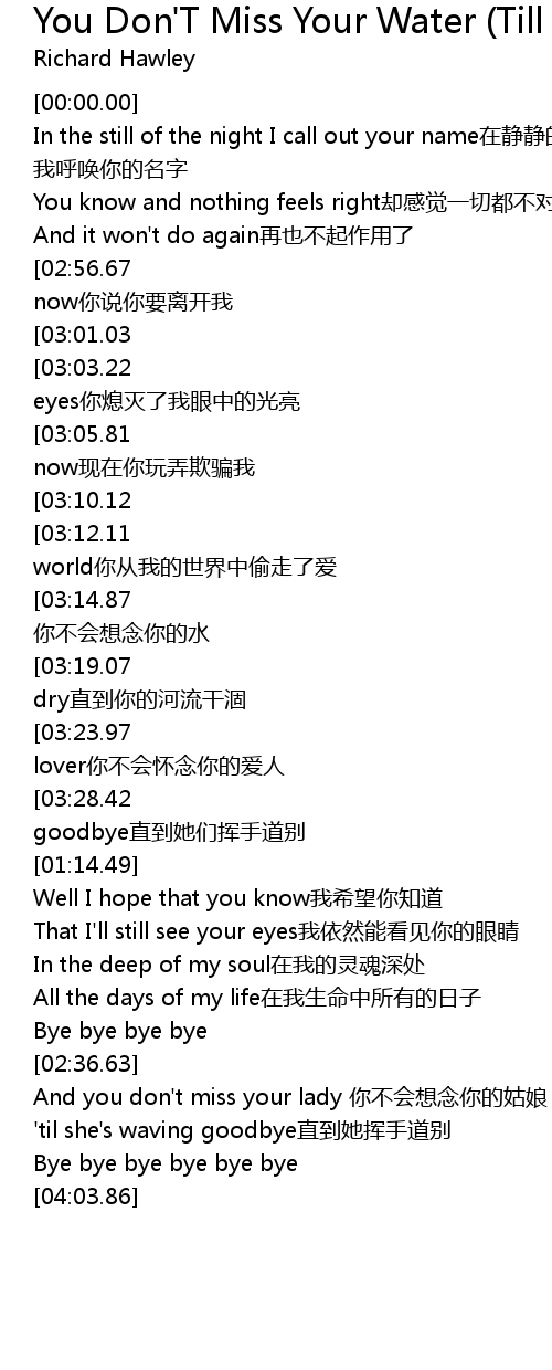 | [02:11.12][03:14.87][03:33.32][00:58.28] | And you don't miss your water 你不会想念你的水 |