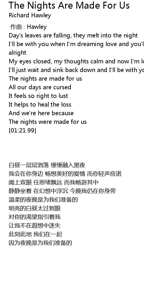 | [00:09.51] | Day' s leaves are falling, they melt into the night |
