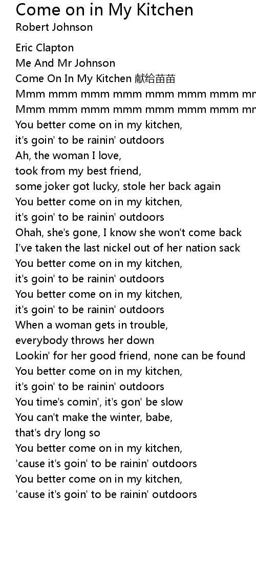 | [00:03.93] | Come On In My Kitchen 献给苗苗 |