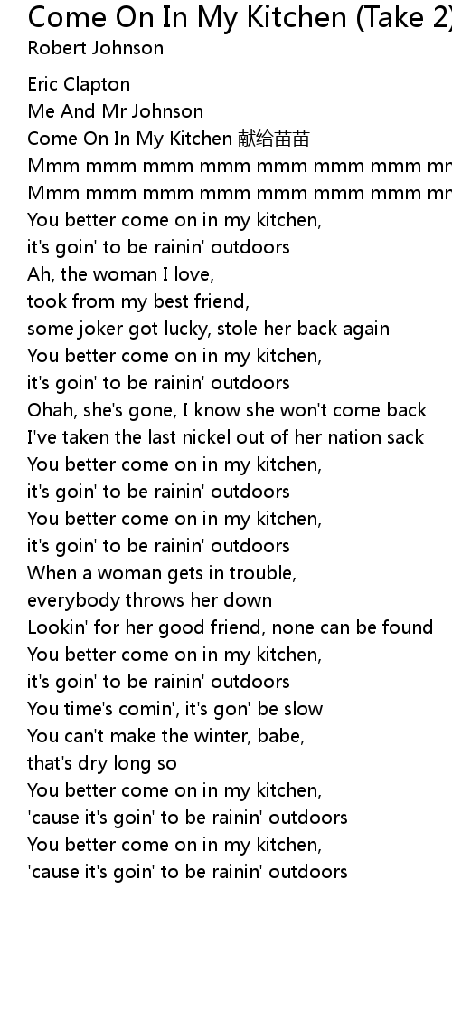 | [00:03.93] | Come On In My Kitchen 献给苗苗 |