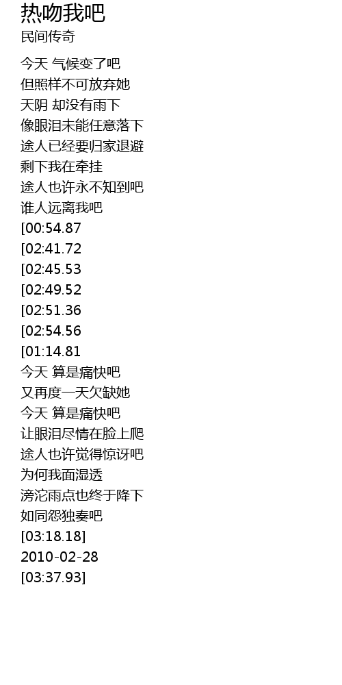 | [03:14.26][02:54.56][02:19.01][01:11.60] | 热吻我吧。。。 |