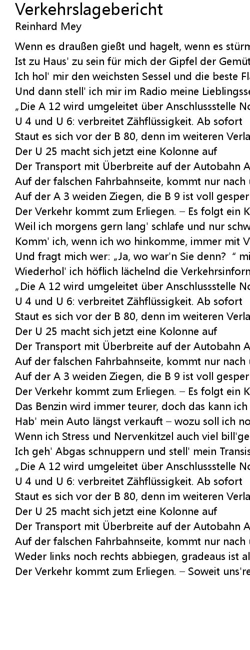 | Wiederhol' ich höflich lächelnd die Verkehrsinformation: | |