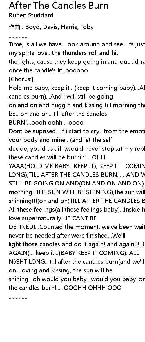 | shining... oh would you baby.. would you baby.. on and on... oh yea ooh .. Till afer the candles burn!.... OOOHH OHHH OOO | |
