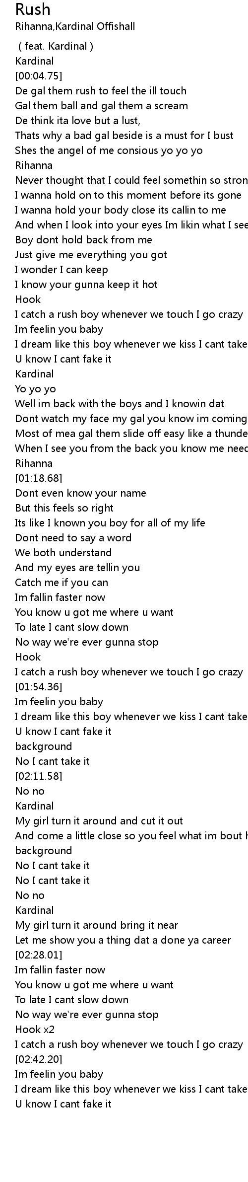 | [02:38.65] | I catch a rush boy whenever we touch I go crazy |