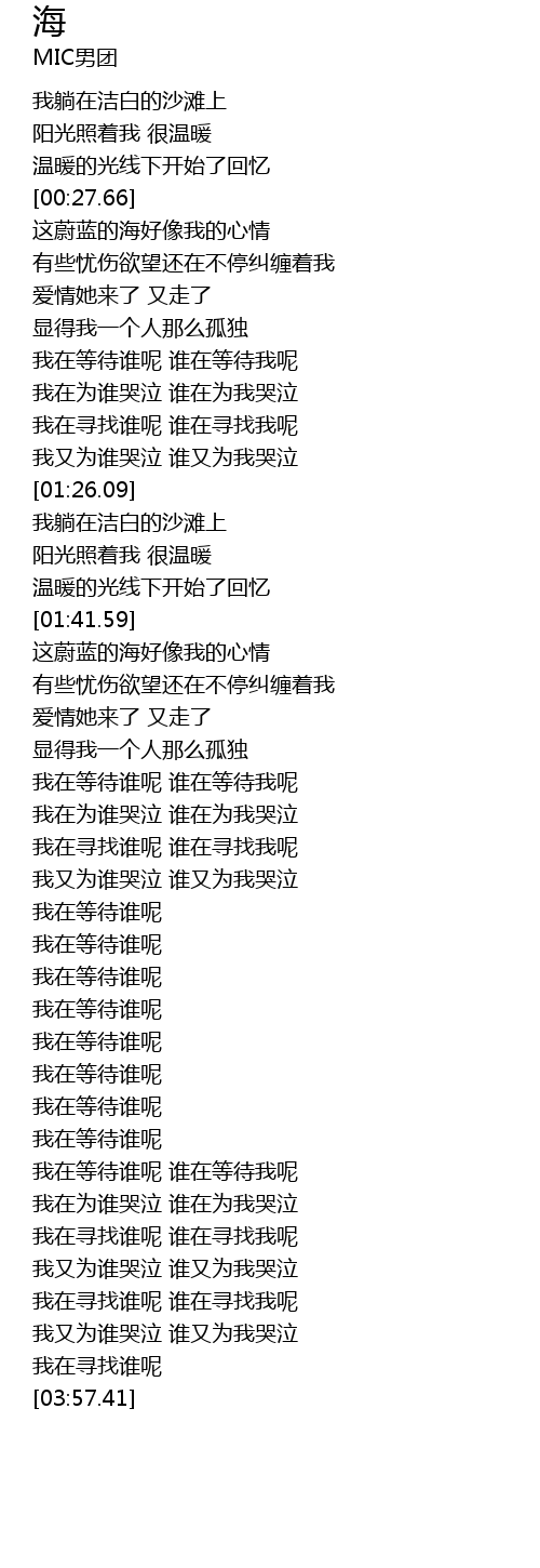 | [00:29.70] | 这蔚蓝的海好像我的心情 |