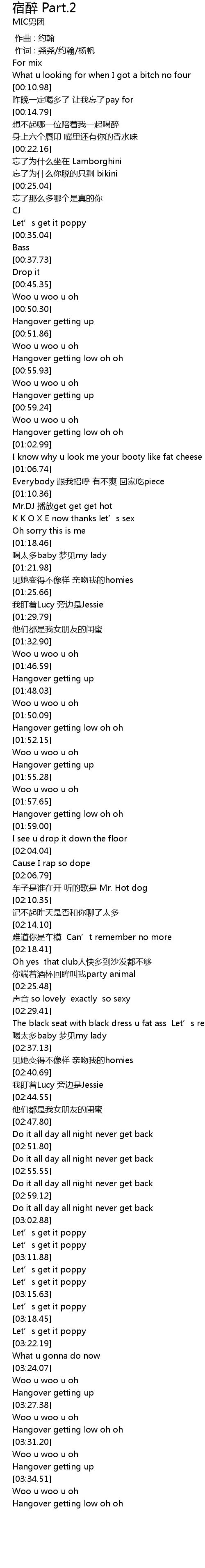 | [03:37.70] | Hangover getting low oh oh |