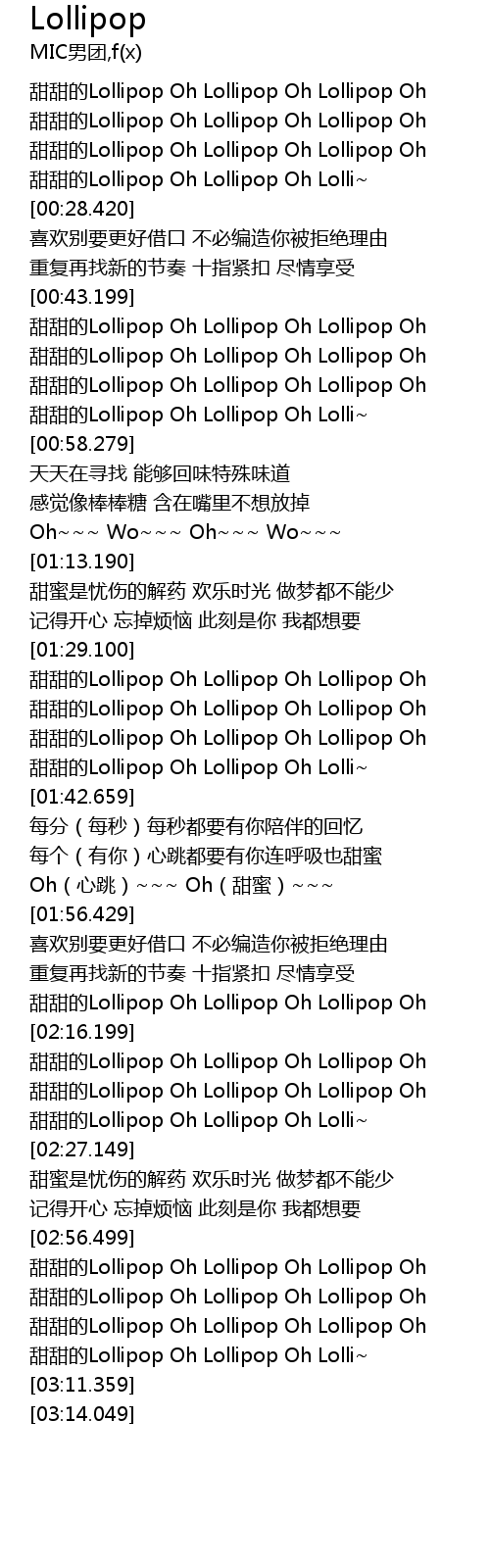 | [03:03.989] | 甜甜的Lollipop Oh Lollipop Oh Lollipop Oh |