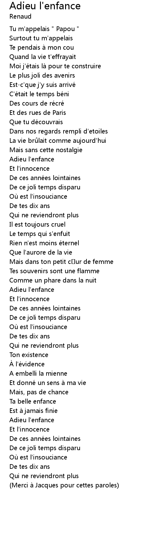| Song | Adieu l'enfance |