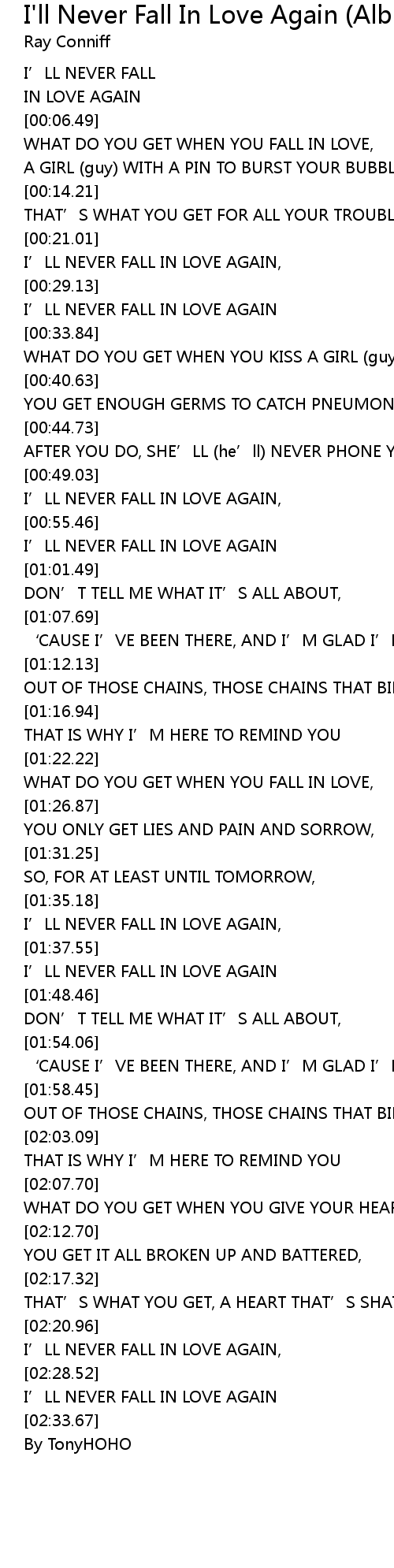 | [01:35.51] | I' LL NEVER FALL IN LOVE AGAIN, |