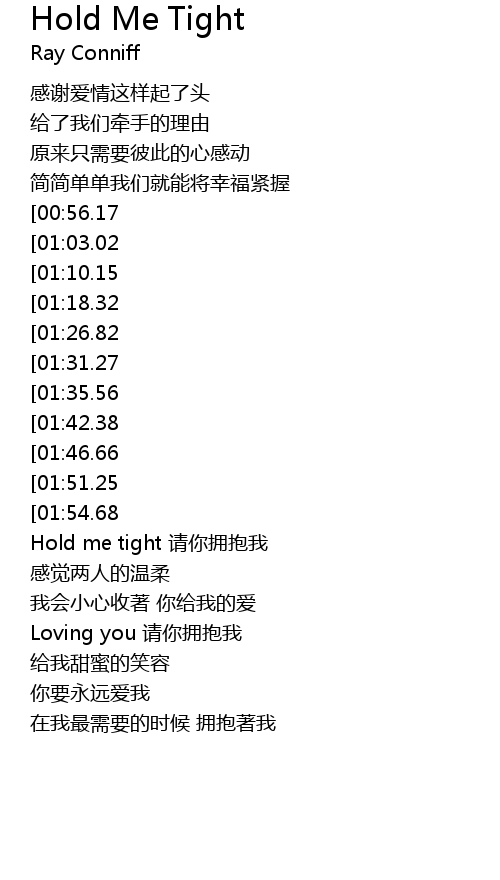 | [03:03.00][01:26.82] | Hold me tight 请你拥抱我 |