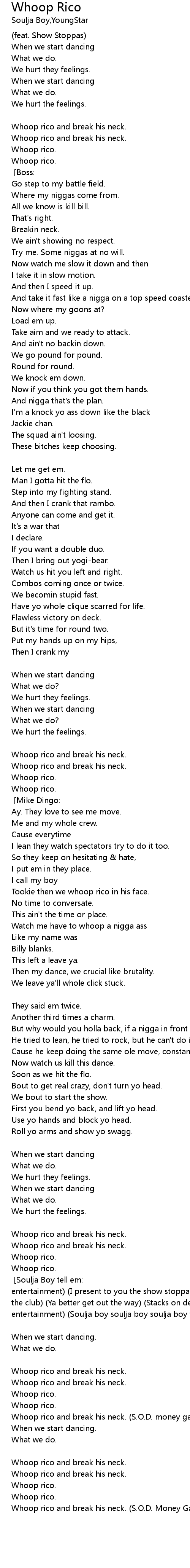 Whoop rico and break his neck [x2] [Soulja Boy tell em:] (S.O.D. money gang entertainment) (I present to you the show stoppas) (When this song come on in the club) (Ya better get out the way) (Stacks on deck) (S.O.D. money gang entertainment) (Soulja boy soulja boy soulja boy tell em)