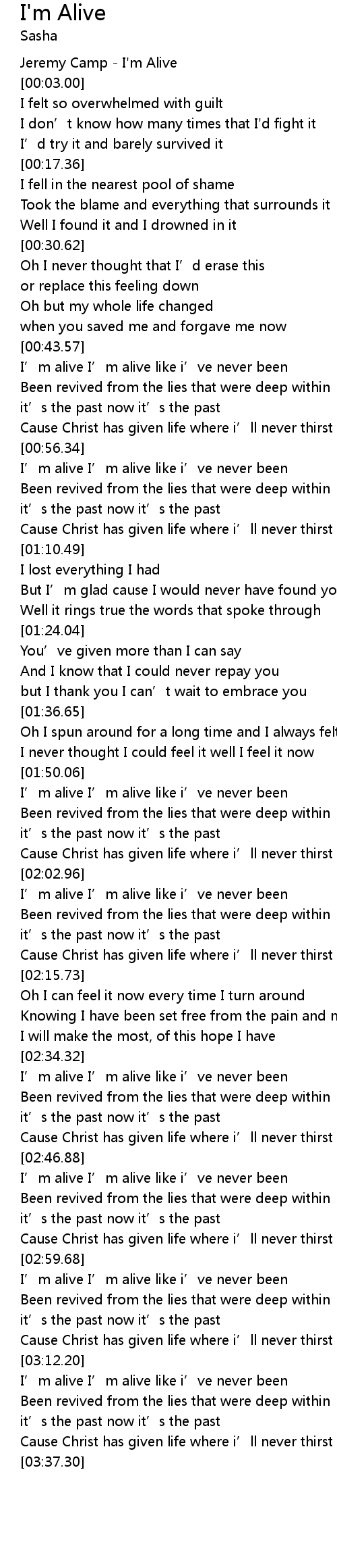 | [00:02.00] | Jeremy Camp - I'm Alive |