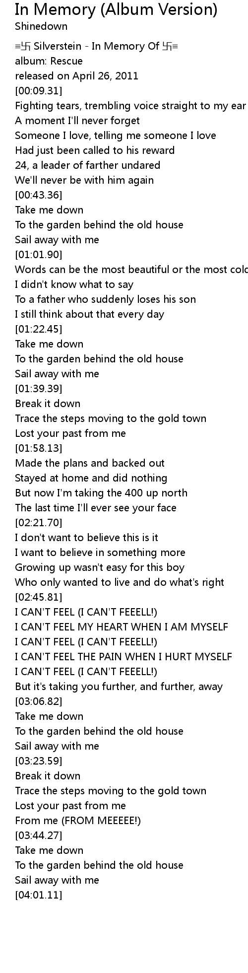 | [00:00.00] | ≡卐 Silverstein - In Memory Of 卐≡ |