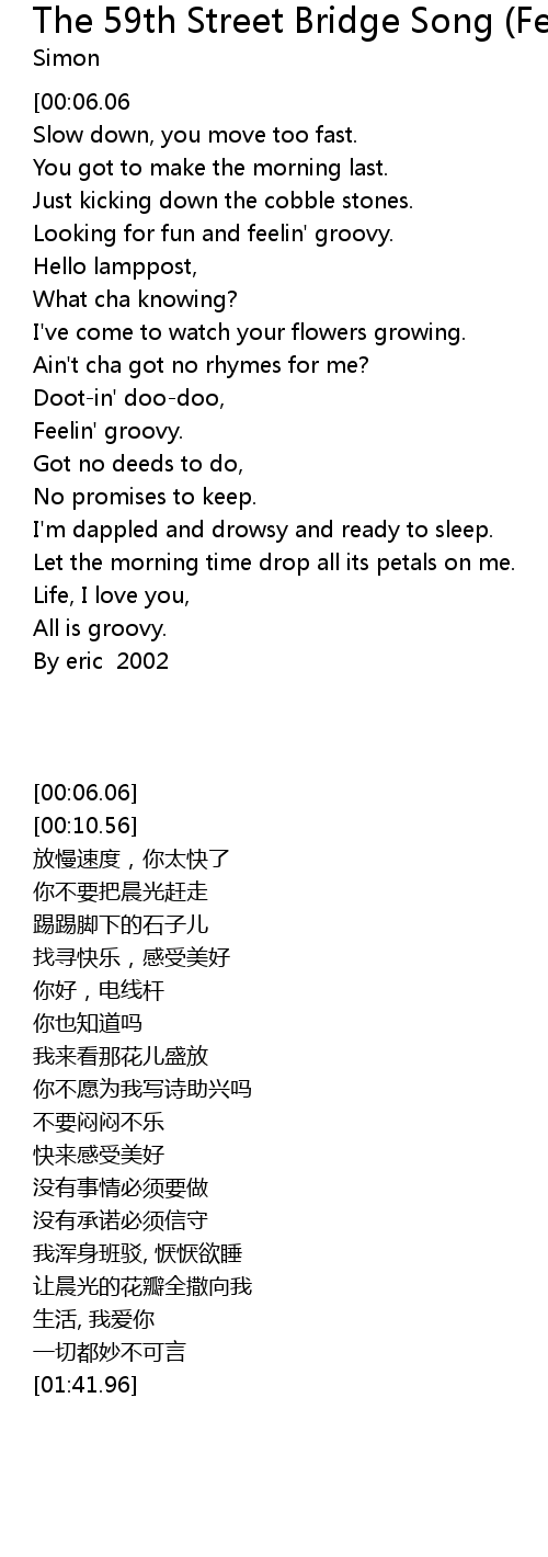 | [00:10.56][00:06.06] | The 59th Street Bridge Song Simon and Garfunkel |