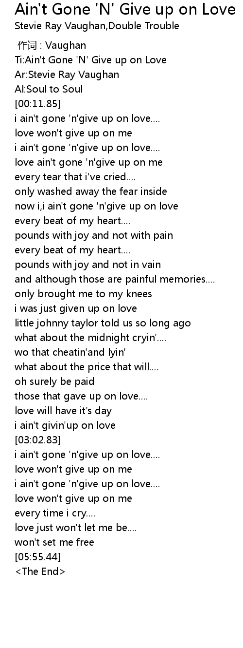 | [00:00.00] | Ti: Ain' t Gone ' N' Give up on Love |