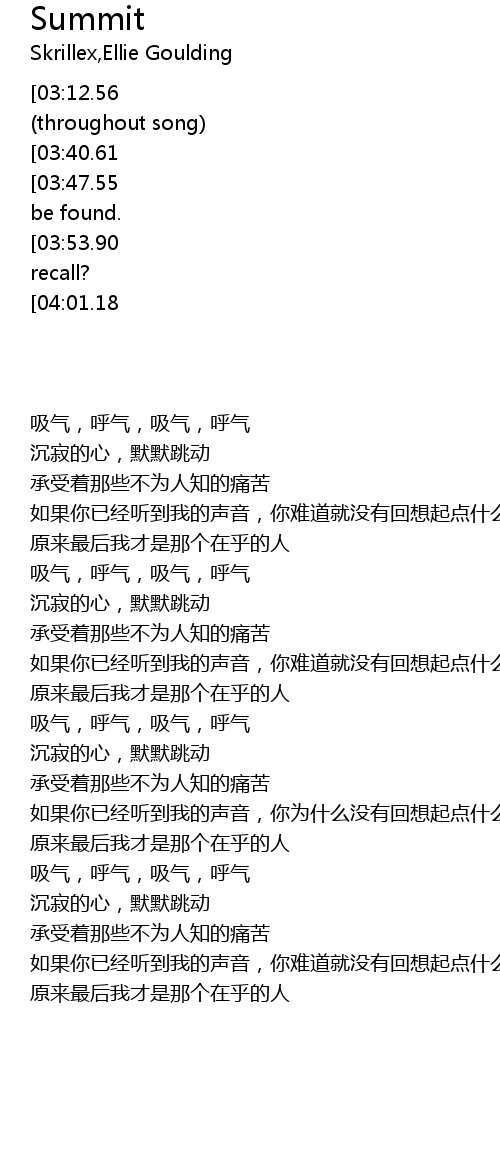 | [04:41.96][03:12.56][01:22.71][00:25.45] | Breathe, breathe... breathe, breathe (throughout song) |