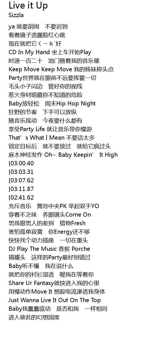 | [03:22.79][03:03.31][02:28.59][01:17.14] | Live It Up 看你Show Ur Body 惹火 |