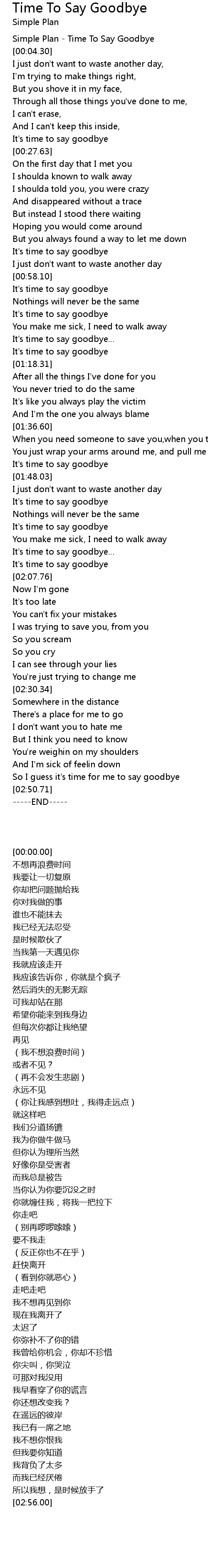 | [00:00.00] | Simple Plan - Time To Say Goodbye |