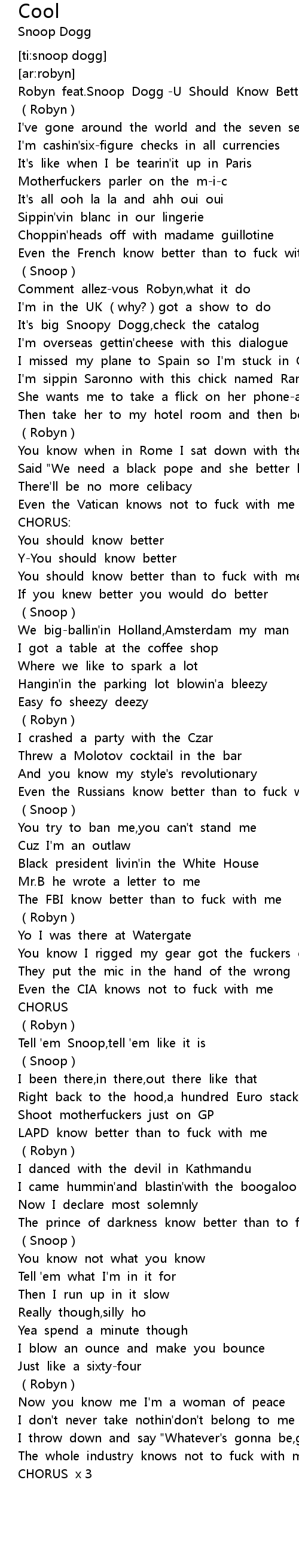| [02:28.259] | Tell ' em Snoop, tell ' em like it is |
