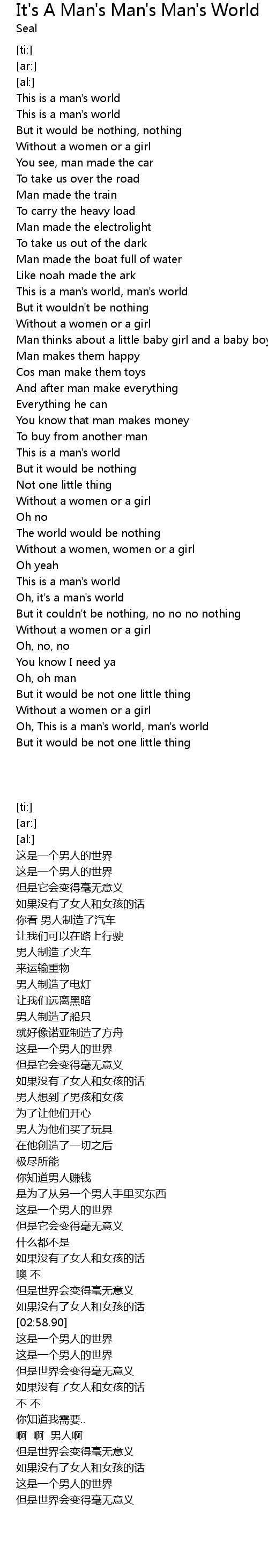 | [03:38.75] | Oh, This is a man's world, man's world |