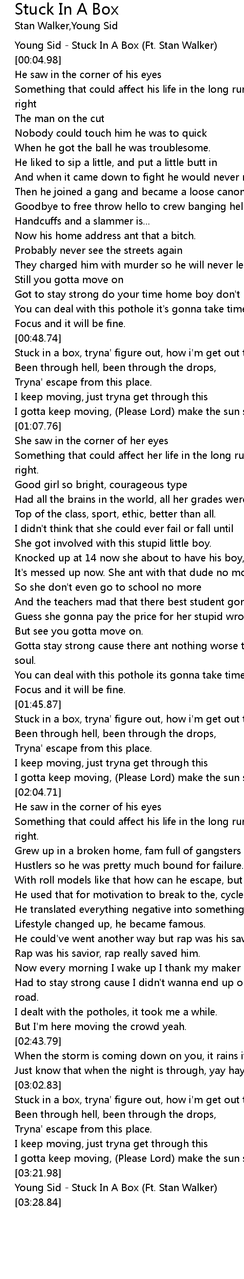Stuck in a box, tryna' figure out, how i'm get out this place. |