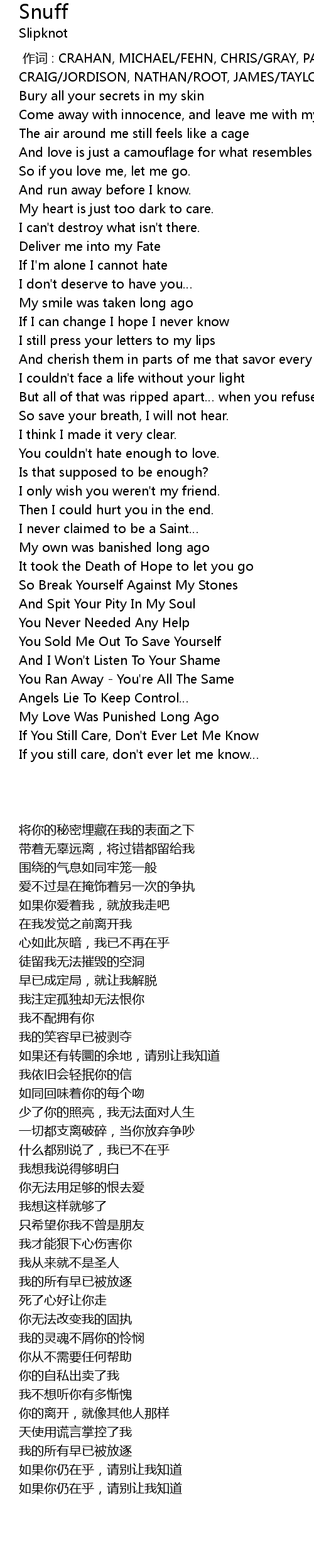 | [00:00.00] | 作词 : CRAHAN, MICHAEL/FEHN, CHRIS/GRAY, PAUL/JONES, CRAIG/JORDISON, NATHAN/ROOT, JAMES/TAYLOR, COREY/THOMS |