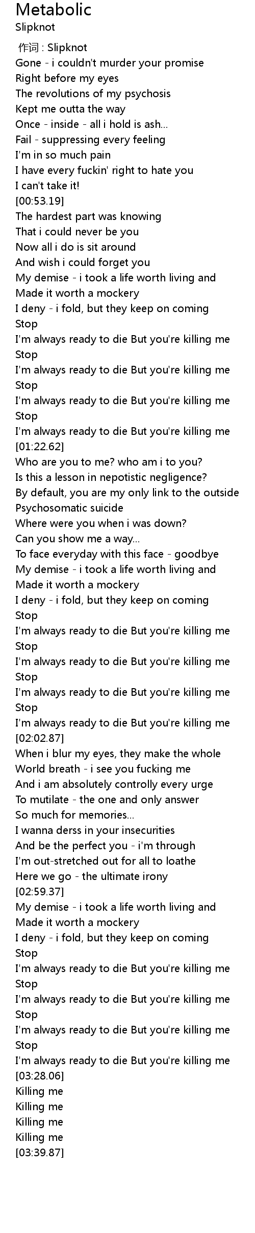 | [03:20.37] | I'm always ready to die But you're killing me |