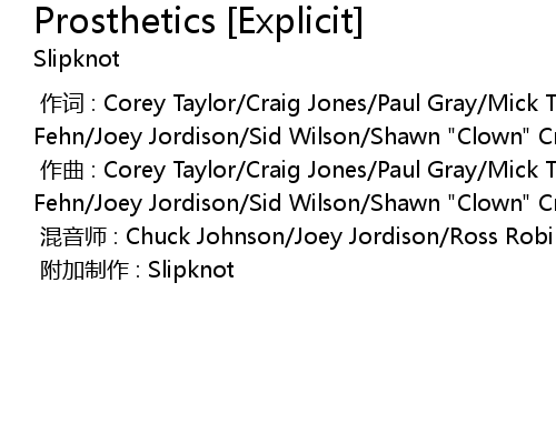 | [00:00.000] | zuo qu : Corey Taylor Craig Jones Paul Gray Mick Thomson Chris Fehn Joey Jordison Sid Wilson Shawn " Clown" Crahan |