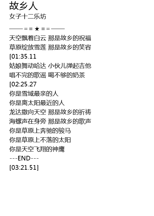| [00:29.11] | 草原绽放雪莲 那是故乡的笑容 |