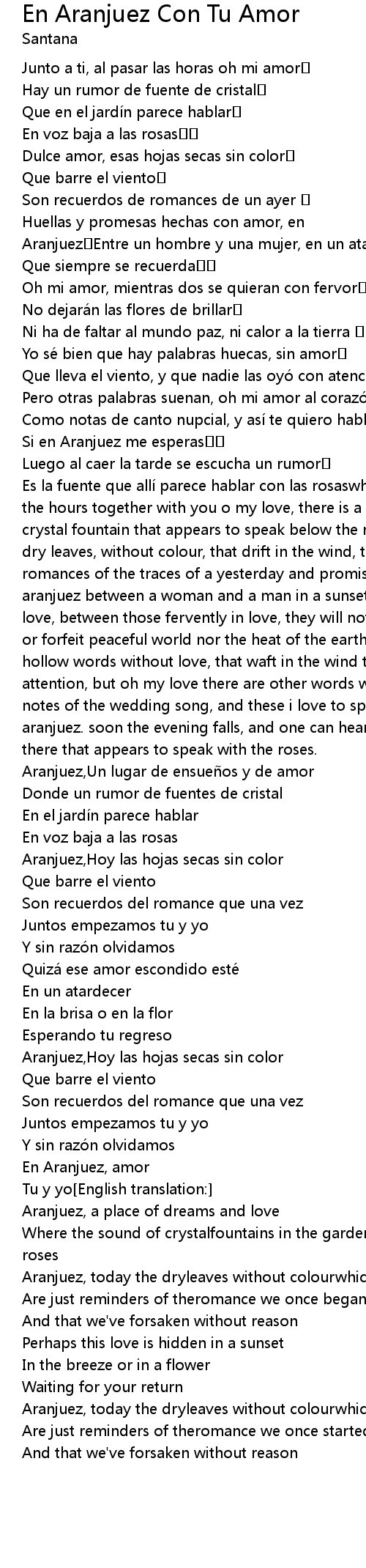 | Es la fuente que allí parece hablar con las rosaswhen it happens that i pass the hours together with you o my love, there is a sound in the garden of the crystal fountain that appears to speak below the roses. sweet love, these are dry leaves, without colour, that drift in the wind, they are memories and romances of the traces of a yesterday and promises that you make with love in aranjuez between a woman and a man in a sunset that is always remembered. o my love, between those fervently in love, they will not leave the blazing flowers or forfeit peaceful world nor the heat of the earth. i know well that there are hollow words without love, that waft in the wind that no one listens to with attention, but oh my love there are other words which sound to the heart like notes of the wedding song, and these i love to speak, if you await me in aranjuez. soon the evening falls, and one can hear the sound it is fountain there that appears to speak with the roses. | |