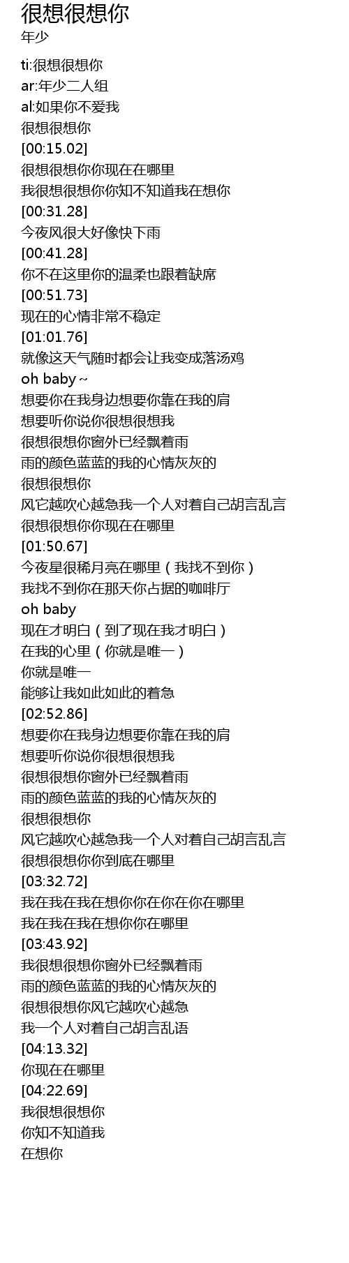 | [00:20.41] | 我很想很想你你知不知道我在想你 |