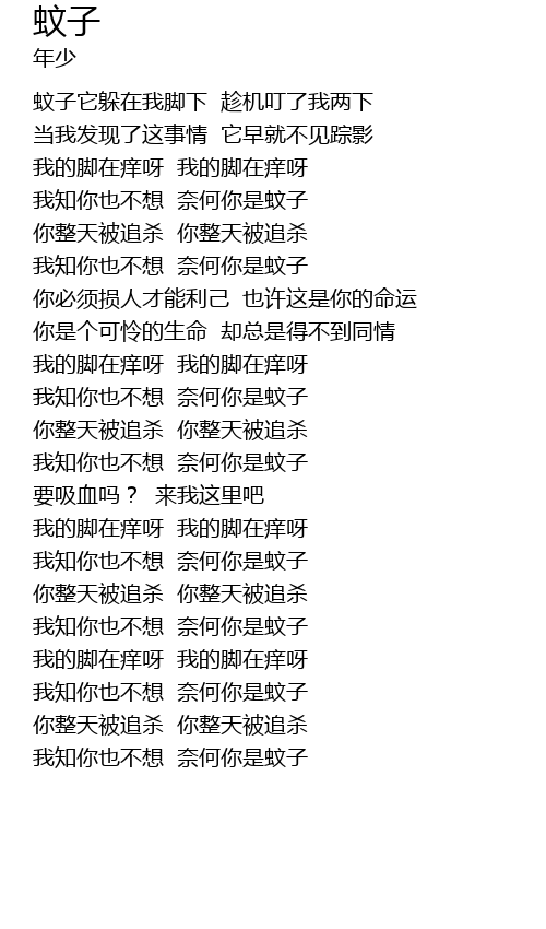| [00:33.55] | 蚊子它躲在我脚下 趁机叮了我两下 |