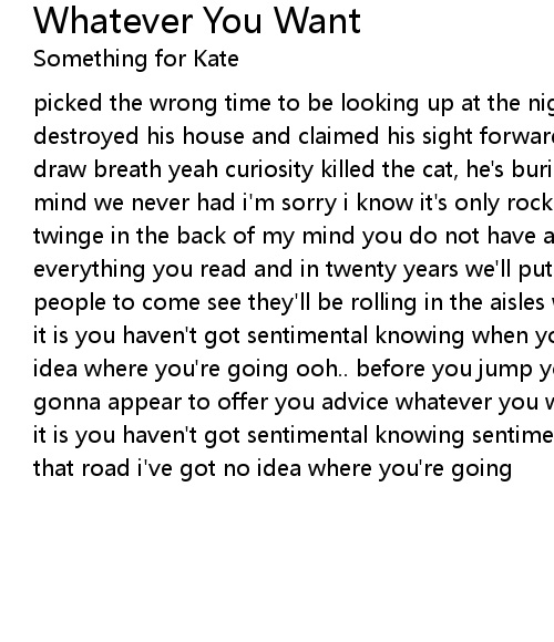 picked the wrong time to be looking up at the night popular belief came down, destroyed his house and claimed his sight forwards in lockstop barely able to draw breath yeah curiosity killed the cat, he's buried alongside every great mind we never had i'm sorry i know it's only rock and roll but i've felt this twinge in the back of my mind you do not have a monopoly on the truth believe everything you read and in twenty years we'll put you behind glass for all the people to come see they'll be rolling in the aisles whatever you want whatever it is you haven't got sentimental knowing when you get on that road i've got no idea where you're going ooh.. before you jump you better think twice no angel's gonna appear to offer you advice whatever you want whatever appeals to whatever it is you haven't got sentimental knowing sentimental knowing when you get on that road i've got no idea where you're going |